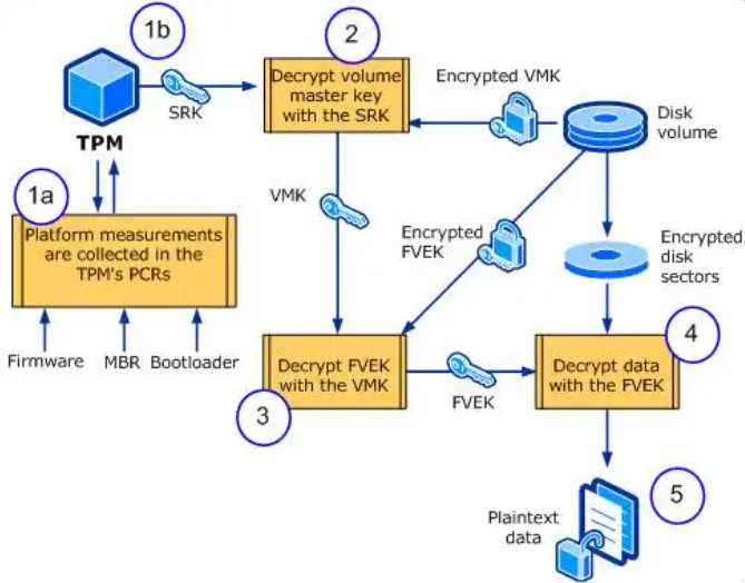 2.如果 PCR 值与期望值相匹配,则 TPM 将使用存储根密钥 (SRK) 对卷主密钥 (VMK) 进行解密。