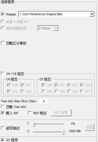 下图选择量产模式,一般情况下“Pretest”选择1;多个不同等级颗粒一起量产时,可勾选“忽略区分等级”(开启“忽略区分等级”功能);“CH/CE组态”可以选择颗粒的某个CE量产(譬如4CE的颗粒坏掉1个CE,可以选择只量产另外2个对称CE,这样就能量产出一半的容量,具体可自测);部分颗粒量产可能报TranADJ错误,此时需要勾选“忽略Tran ADJ”。