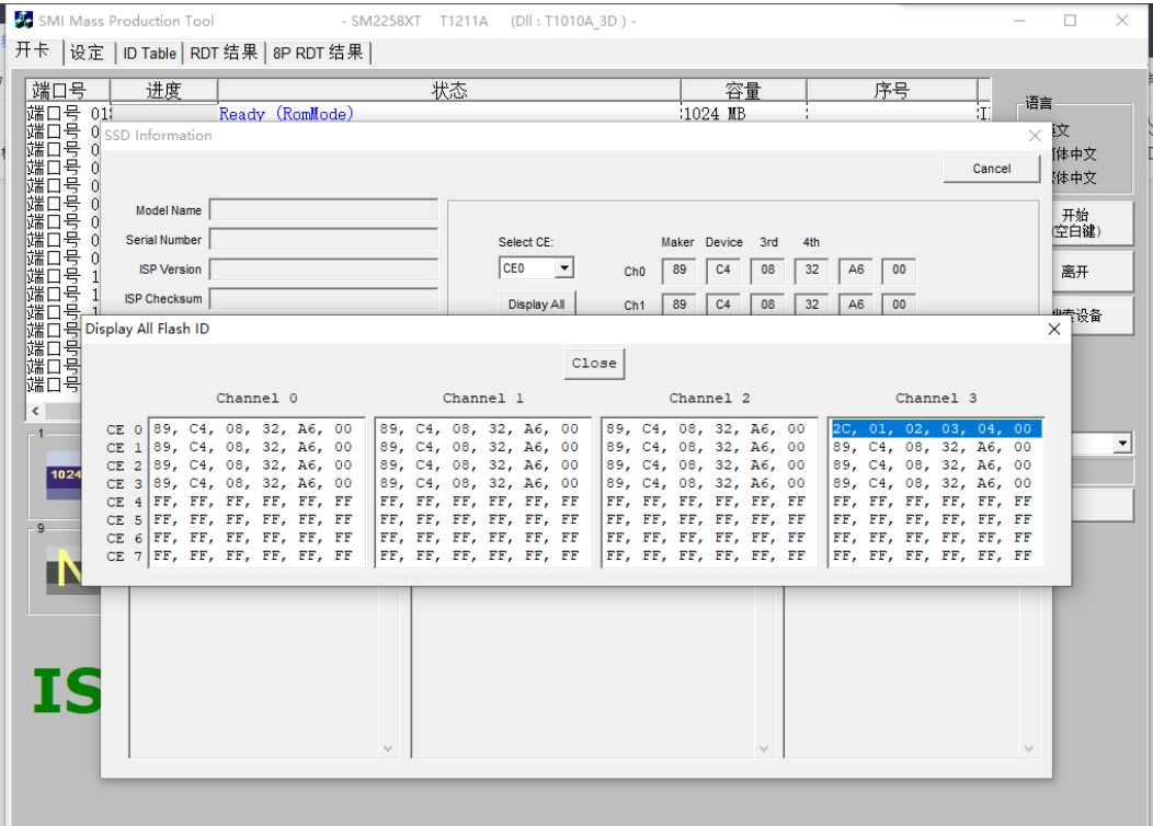 点击“1024M”,查看ID显示是否正常,有无缺失(如下图,是Channel3的CE0错误),CE错误的原因可能是颗粒损坏、主控损坏、主板损坏、焊接不良等等,一一排除直到正确显示。