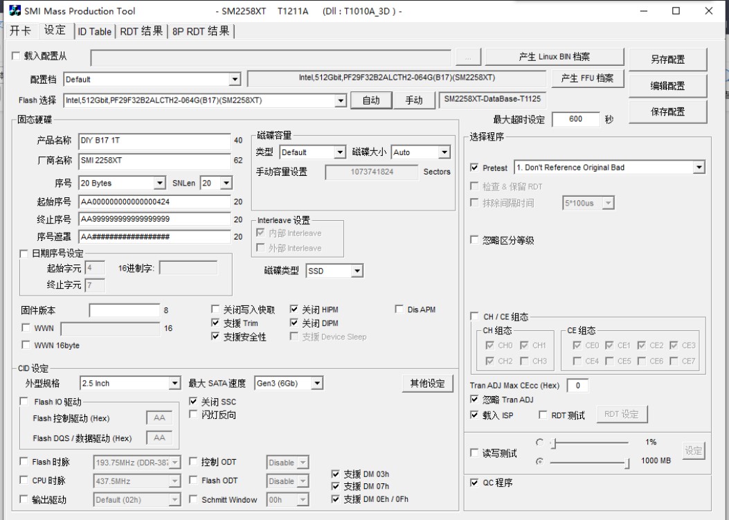 需要注意的是,RDT结束后仍需要进行一次ISP开卡,如下图在“Pretest”里可选择3(参考RDT坏块量产),并且不再勾选“RDT测试”,这样量产出的SSD已经屏蔽了坏块,使用起来相对稳定。