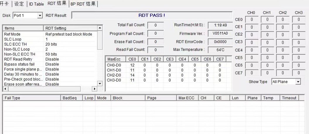 RDT结束后可通过下图查看RDT结果,显示RDT PASS则为正常,如未通过可能是颗粒损坏严重。